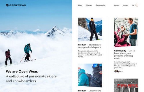 Open Wear 這個網站同樣采用了分屏式的布局,不過兩側內容的輕重屬性均不相同,這樣的不對稱使得用戶會更自然地瀏覽右側的內容頁。