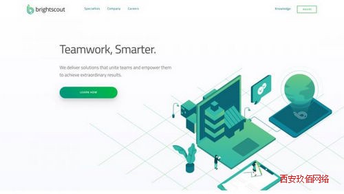 Brightscout 這個網站的首屏采用了微妙有趣的對角線式的布局。圖片和文字說明錯落地分布在網站當中,這種錯落而整齊的布局給人的感覺也頗為開放,滾動的過程中,縮放式的動效會讓人忍不住不停滾動瀏覽下去。而頁面最終也確實導向到了一個CTA按鈕,功能顯而易見。