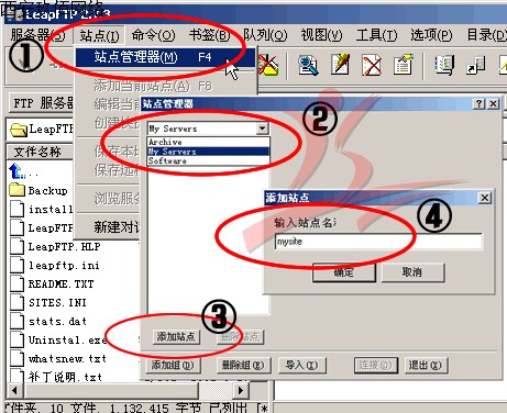 LeapFTP 使用方法:[假設(shè)您的域名為:abc.com,您的FTP用戶名則為:abc] 1.請先下載并安裝 LeapFTP 最新版本。您也可使用其它 FTP工具,請直接參考下面的設(shè)置方法。 2. 運(yùn)行 LeapFTP,點(diǎn)擊1處(站點(diǎn)->站點(diǎn)管理器),彈出“站點(diǎn)管理器”窗口;在2處選擇“My Servers”項(xiàng),然后在3處點(diǎn)擊“添加站點(diǎn)”按鈕,在彈出的窗口4處輸入您喜歡的站點(diǎn)名稱(如:mysite);