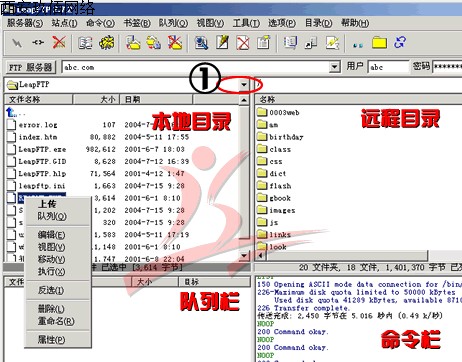 6.連接成功后的界面如下圖所示。左上框?yàn)楸镜啬夸洠梢酝ㄟ^ 1 處的下拉菜單選擇您要上傳文件的目錄,選擇后該目錄下的所有文件都會(huì)顯示在這個(gè)框里。 選擇您要上傳的文件,并點(diǎn)鼠標(biāo)“右鍵”>“上傳”, 這時(shí)在隊(duì)列欄里會(huì)顯示正在上傳及未上傳的文件, 當(dāng)您的文件上傳成功完成后,在命令欄里會(huì)出現(xiàn)“傳送完成”的提示,此時(shí)在過程目錄欄里就可以看到您上傳的文件了。