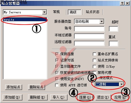 4.點(diǎn)擊上圖 6 處, 切換到“高級”標(biāo)簽(如下圖)。 在1處選中剛建立的站點(diǎn)名稱(mysite),在2處的“傳送模式”選擇二進(jìn)制,點(diǎn)擊3處“應(yīng)用”。至此您的FTP站點(diǎn)已經(jīng)建立成功;
