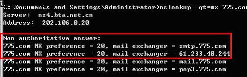 使用方法:nslookup+空格+-qt=mx+空格+域名,見下圖