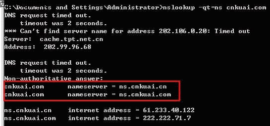 說明:nslookup命令的顯示結果有時為超時,這并不能說明域名DNS服務器速度慢,只能說明客戶端網絡不通暢,請重新測試,即可成功。如果需要查看域名的別名記錄(CNAME記錄),則命令如下:nslookup+空格+-qt=cname+域名,即可得到域名解析的別名記錄。