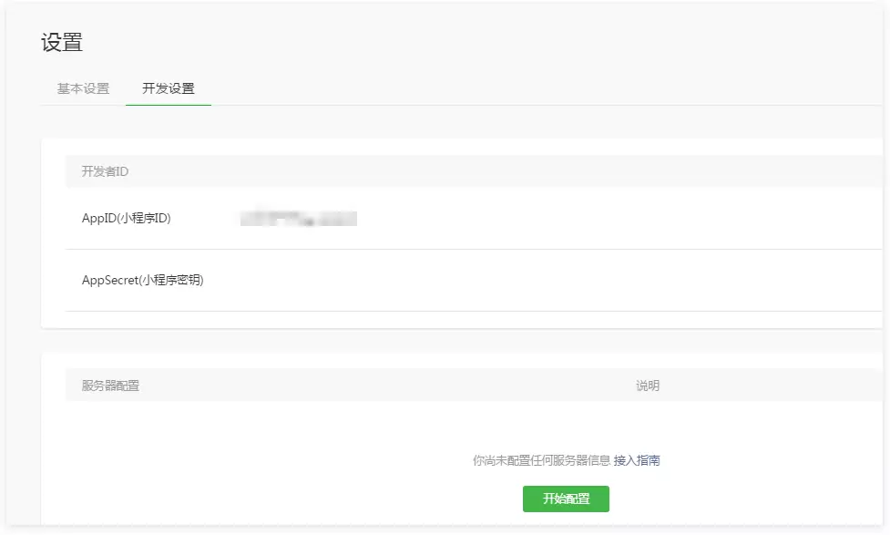登錄微信公眾平臺,就可以在網站的“設置”-“開發者設置”中,查看到微信小程序的 AppID 了,注意不可直接使用服務號或訂閱號的 AppID 。