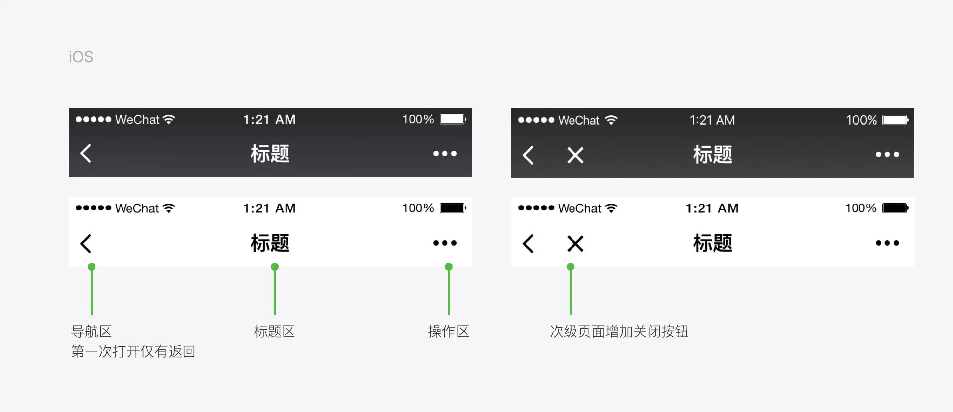 微信進入小程序的第一個頁面,導航區通常只有一個操作——“返回”,即返回進入小程序前的微信頁面。 進入小程序后的次級頁面,導航區的操作為——“返回” 和“關閉”。 “返回”,即返回上一級小程序界面或微信界面。“關閉”,即在當前界面直接退出小程序,回到進入小程序前的微信頁面。
